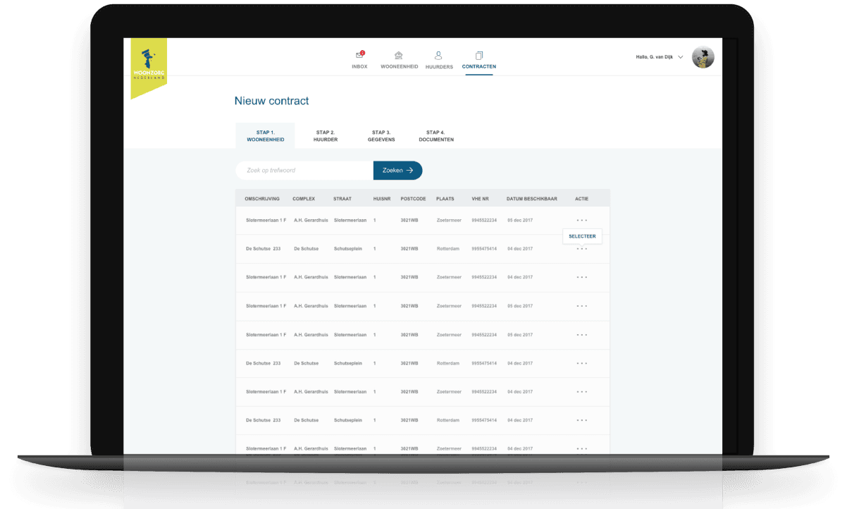Een portal voor de administratie van huurders voor Woonzorg gemaakt in Sketch & HTML.